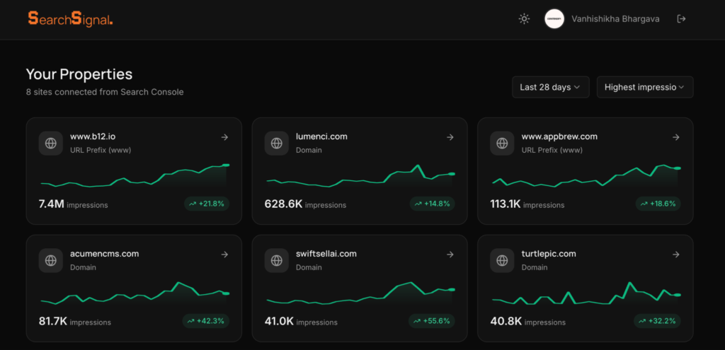 Once you’re logged in, Search Signal will automatically pull all the properties you have access to view data from. Next, click on the website you want to deep dive into to see the analysis that Search Signal has completed.