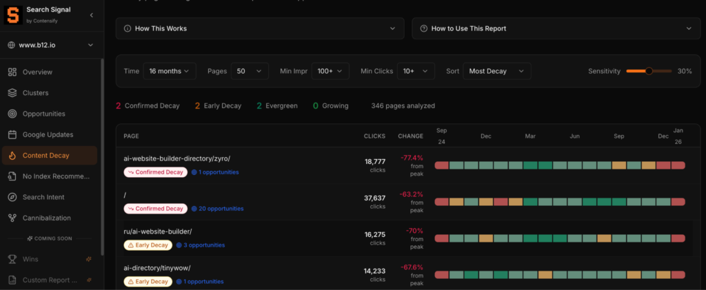 Next, you want to see what you can do to save the content that is decaying or has decayed. Search Signal also highlights the opportunities so that you don’t have to guesswork the updates or refreshes.